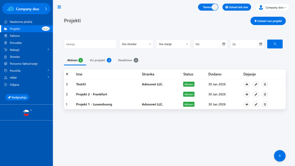 1. Stran Projekti – pregled in filtriranje #
