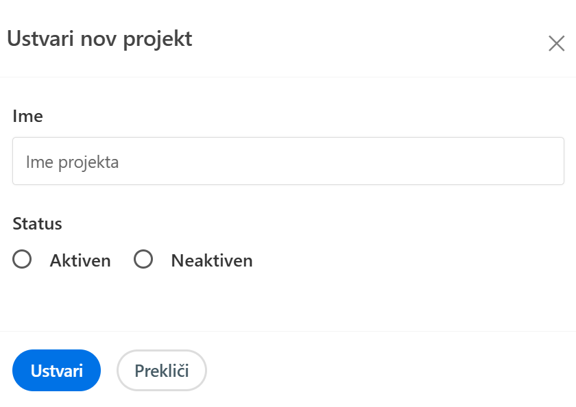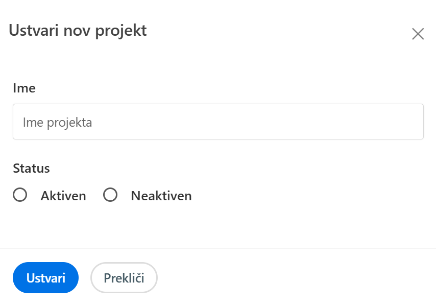 Če status ni izbran, bo projekt privzeto ustvarjen kot neaktiven, kar lahko kasneje spremenite.