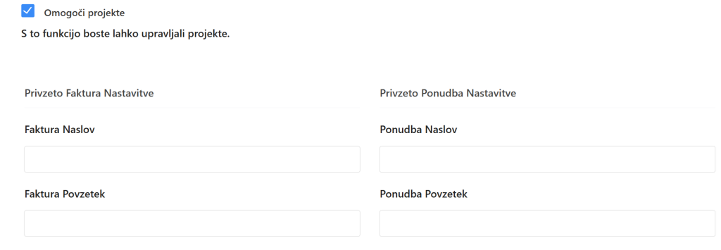 - funkcijo vključite ali izključite s potrditvijo / odstranitev kljukice pri možnosti Omogoči projekte