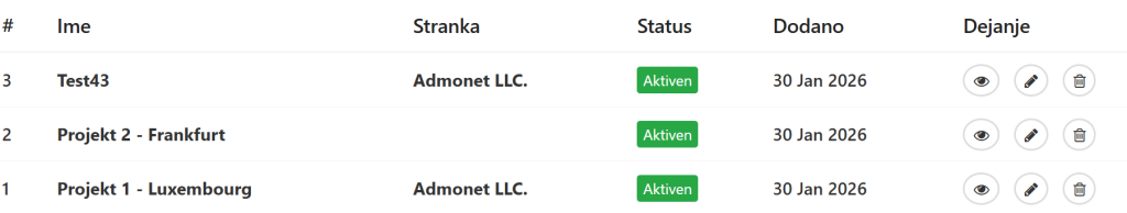 Vsak projekt v tabeli prikazuje naslednje informacije:
