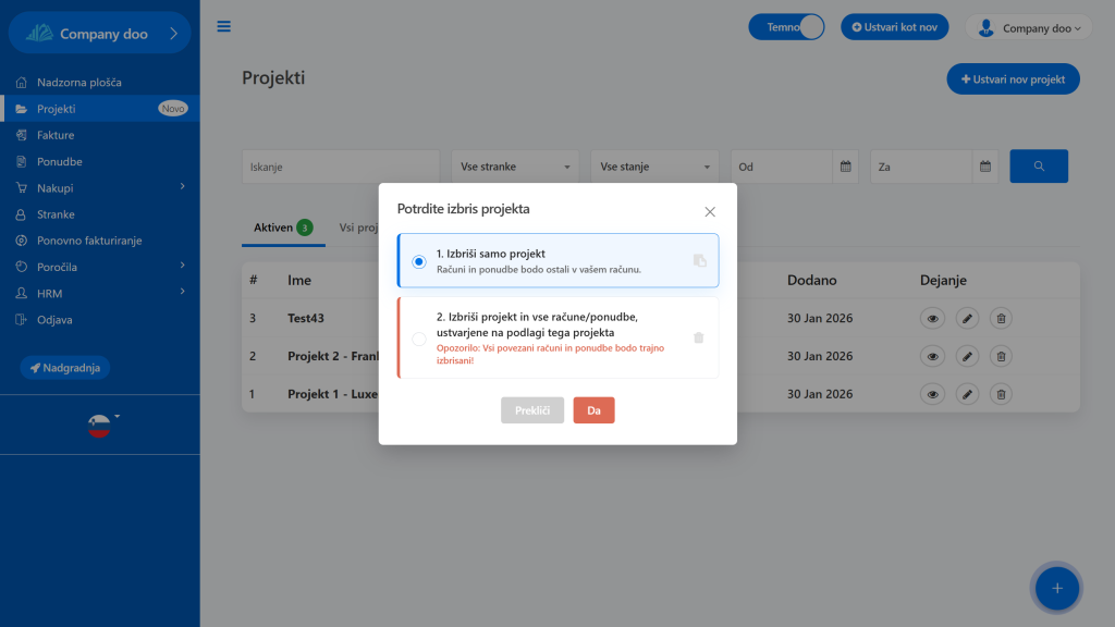 - Izbriši projekt in vse račune/ponudbe,ustvarjene na podlagi tega projekta