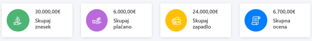 - Skupaj zapadlo – znesek, ki ga je še treba pobrati